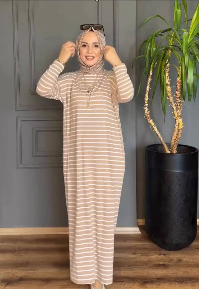 Bej Çizgili Yanları Yırtmaç Detaylı Elbise