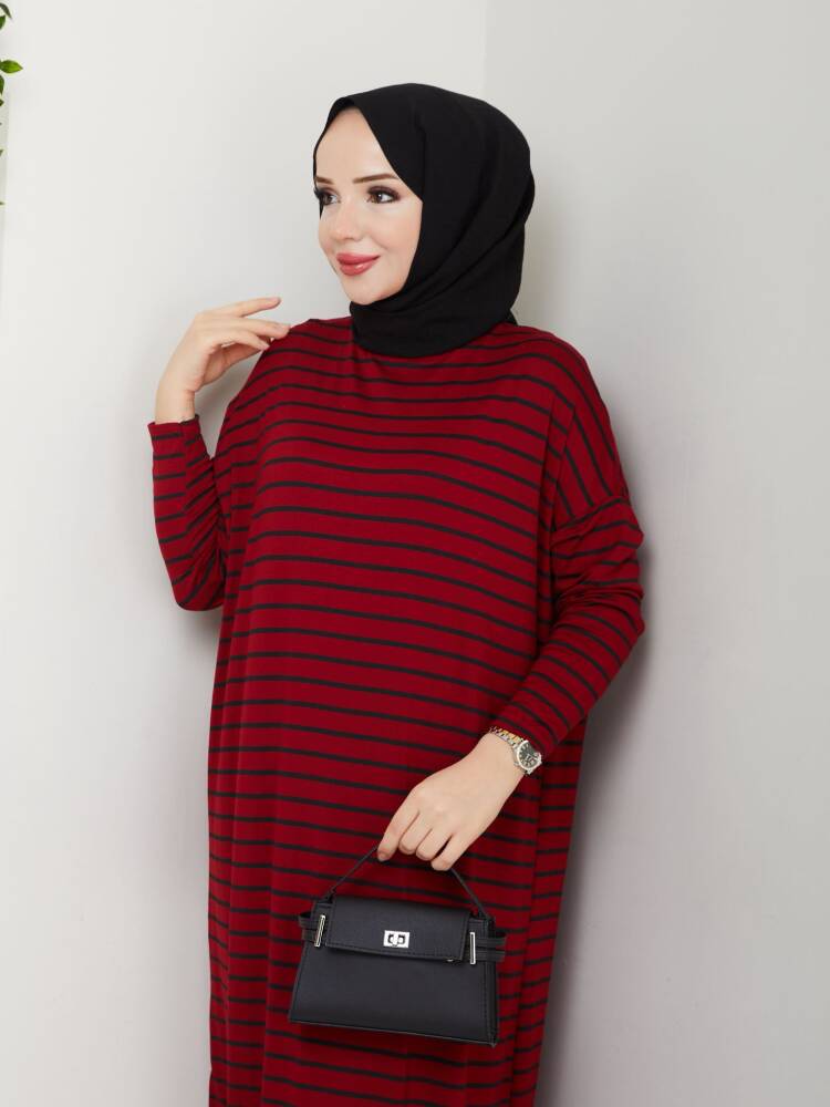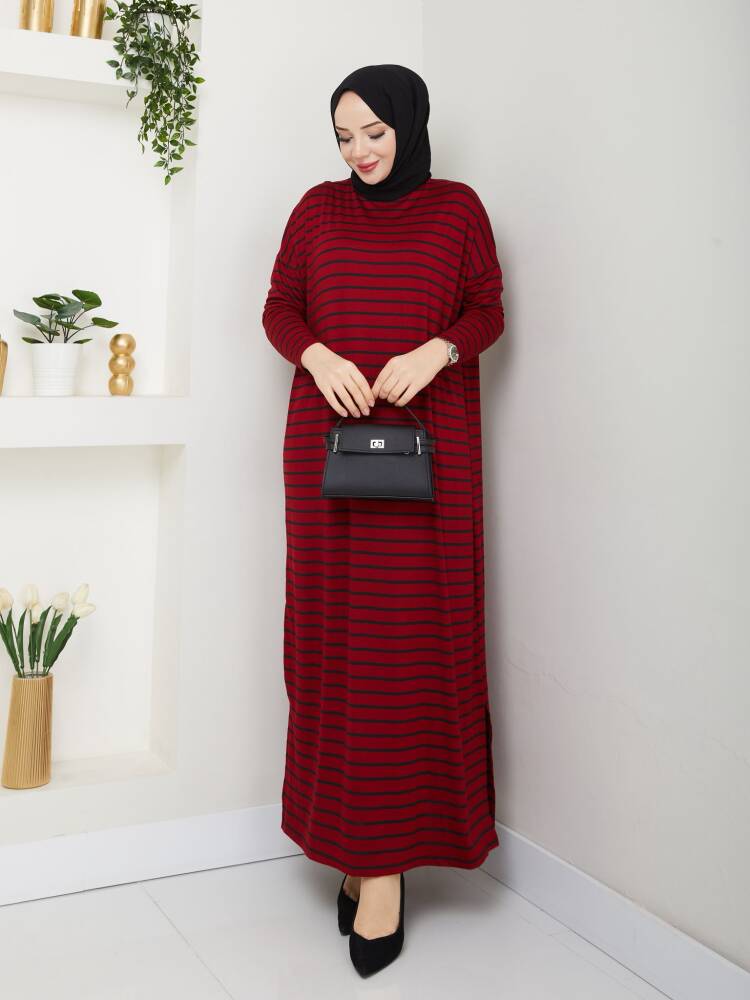 Bordo Çizgili Yanları Yırtmaç Detaylı Elbise