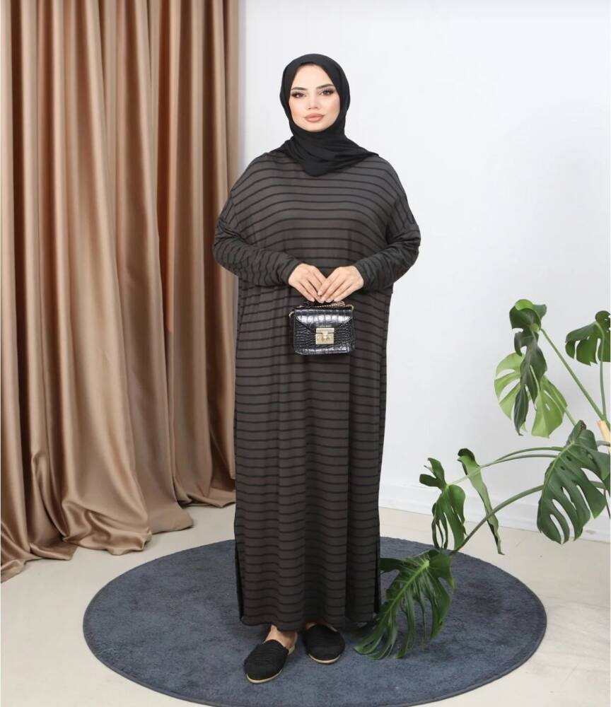 Haki Yeşil Çizgili Yanları Yırtmaç Detaylı Elbise