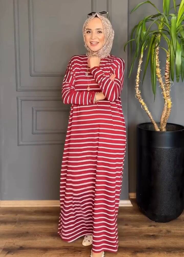 Kırmızı Çizgili Yanları Yırtmaç Detaylı Elbise