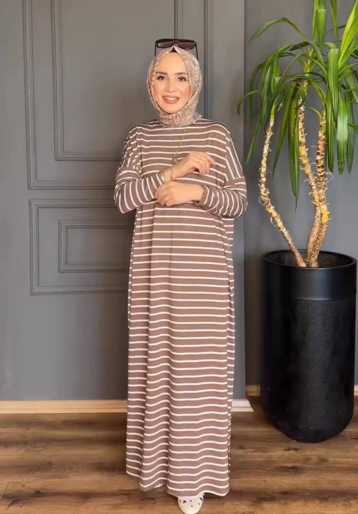 Vizon Çizgili Yanları Yırtmaç Detaylı Elbise